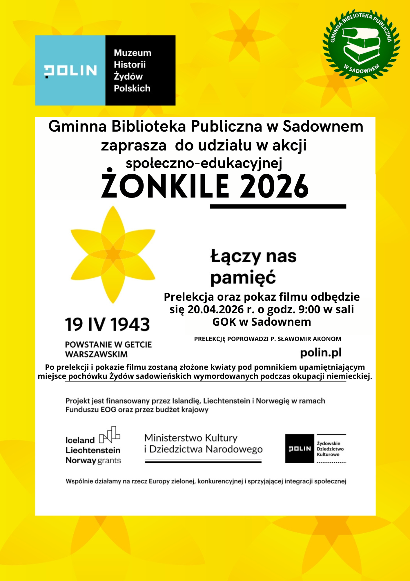 Gminna Biblioteka Publiczna w Sadownem zaprasza mieszkańców do wzięcia udziału w tegorocznej edycji ogólnopolskiej akcji społeczno-edukacyjnej "Żonkile 2026". Inicjatywa ta, organizowana we współpracy z Muzeum Historii Żydów Polskich POLIN, ma na celu upamiętnienie rocznicy wybuchu powstania w getcie warszawskim, które rozpoczęło się 19 kwietnia 1943 roku.